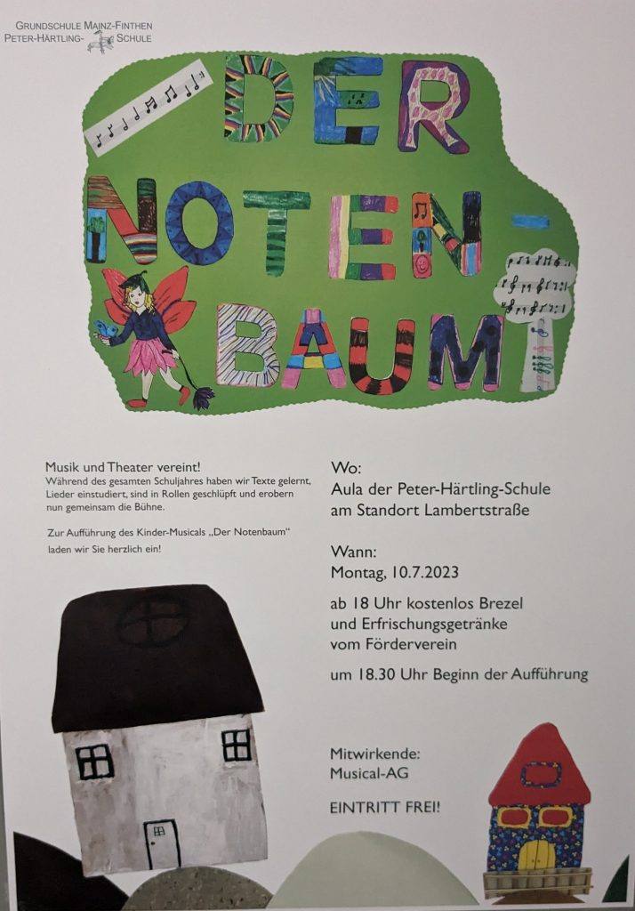 Über das gesamte Schuljahr hinweg fand immer dienstags die Musical-AG statt. Die etwa 30 Kinder übten Lieder und Texte ein, bastelten Kostüme und Kulissen und stellten nun zunächst allen Klassen der Schule das Stück „Der Notenbaum“ vor. 45 min lang verfolgten die Besucher das wunderschöne Stück.